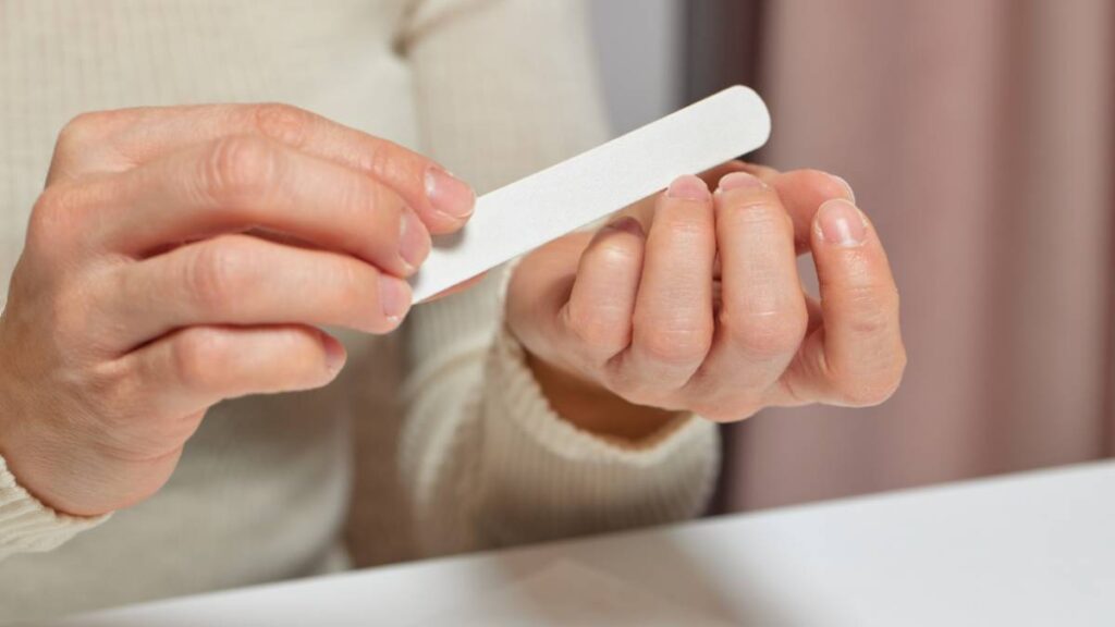 Hold the nail file parallel to your nail tip—avoid a seesaw motion. Filing in one direction prevents splitting and helps nails stay strong, forming the shape you prefer for your at home manicure.
